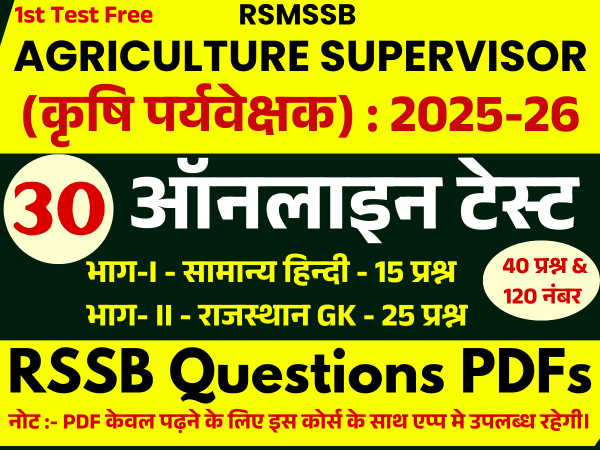 RSMSSB Agriculture Supervisor (कृषि पर्यवेक्षक) : 2025-26 – भाग-I & भाग- II (40 Question & 120 Marks) - 30 ऑनलाइन टेस्ट 30 ऑनलाइन टेस्ट :- Topic Wise Test (14) Full Test (16) भाग-I - सामान्य हिन्दी - 15 प्रश्न भाग- II - राजस्थान GK - 25 प्रश्न परीक्षा में सभी प्रश्न वैकल्पिक होंगे। कुल 120 अंकों का होगा। इसमें प्रश्नों की संख्या 40 (भाग-I - सामान्य हिन्दी - 15 प्रश्न + भाग- II - राजस्थान GK - 25 प्रश्न) रखी गई है। प्रश्न पत्र में प्रत्येक प्रश्न 3 अंक का होगा। इसमें नेगेटिव मार्किंग 1/3 भाग रखी गई है। प्रश्न पत्र को हल करने के लिए 1 घंटे का समय मिलेगा। RSMSSB की विषयवार Old Questions PDF जो सलेक्शन के लिए रामबाण साबित होगी । (2014 से 2025 तक अपडेट) 👉PDF जो टेस्ट सीरीज के कंटेंट में पढ़ने के लिए उपलब्ध है - 1. हिन्दी 2. सामान्य ज्ञान (राजस्थान के सन्दर्भ में) a.राजस्थान का इतिहास, कला, संस्कृति, साहित्य, परम्परा एवं विरासत b.राजस्थान का भूगोल टेस्ट सीरीज की विशेषताएं :- • टॉपिक वाइज टेस्ट के साथ- साथ Full Syllabus आधारित टेस्ट। • परीक्षा से पहले परीक्षा का अनुभव देने वाले टेस्ट। • प्रत्येक प्रश्न 360° पर शानदार Solutions • विषय विशेषज्ञों एवं Exam Experts टीम द्वारा हूबहू परीक्षा जैसे प्रश्नों के टेस्ट तैयार। • साथ ही पाए विषयवार RSMSSB Old Questions PDFs. • 1st टेस्ट फ्री है, अपनी तैयारी परखने के लिए जरूर देवें।